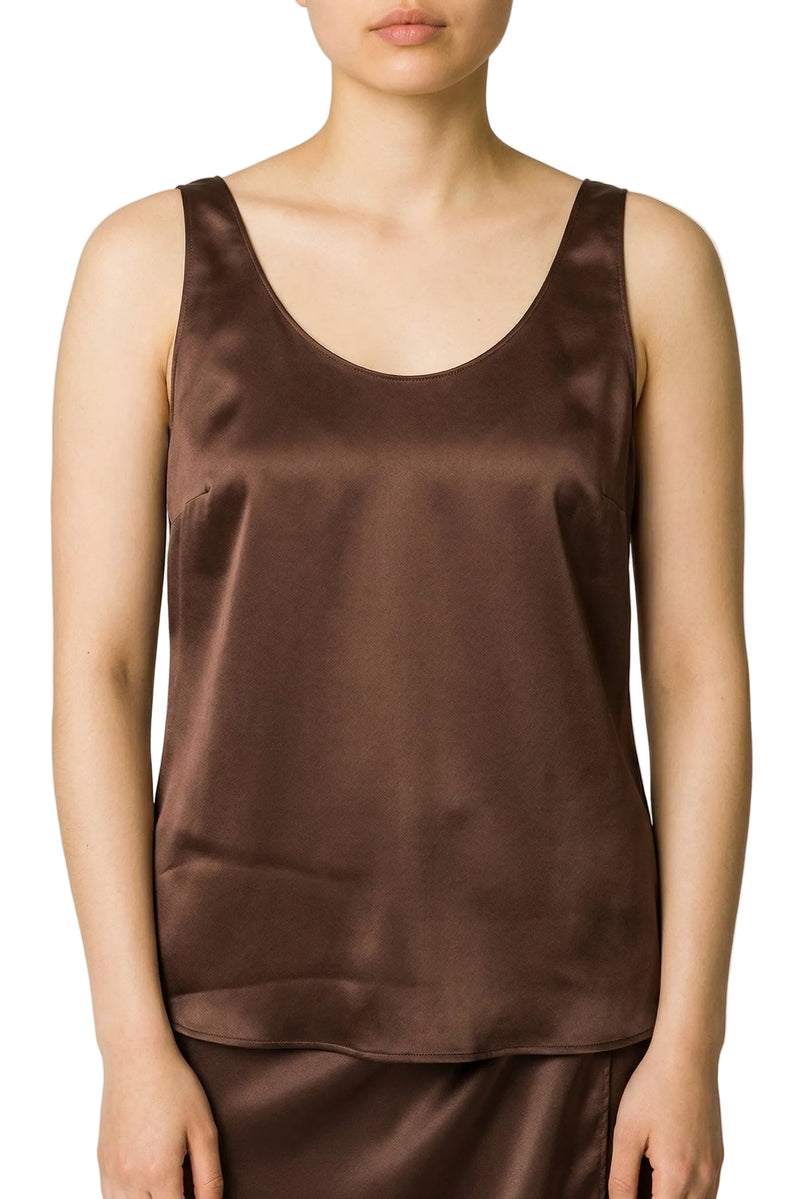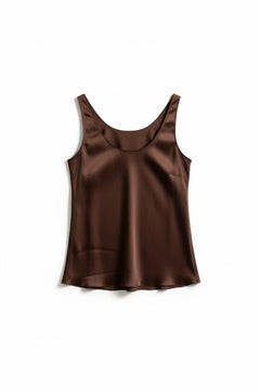 Smooth and fluid, this mahogany silk tank offers an effortlessly elegant silhouette with a soft, lustrous finish. Designed to drape beautifully along the body, it features a clean scoop neckline and a relaxed fit that moves with ease, creating a refined, understated look.